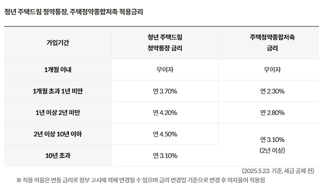 단, 분양주택 청약에 당첨된 계좌는 가입(전환)일로부터 2년 미만이어도 가입기간별 청년 주택드림 청약통장 금리를 적용받을 수 있어요.