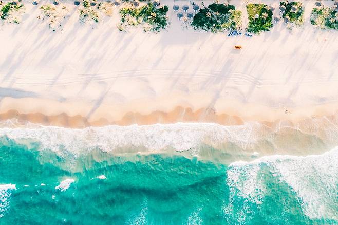 새파란 바다와 야자수가 고갱의 그림처럼 펼쳐지는 남국의 풍경. 온통 원색이다. 바다를 향한 풀빌라 유리문을 열고 골프장처럼 곱게 정리된 잔디밭을 거쳐 해변으로 나갔다. 뜨겁게 달구어진 모래밭을 맨발로 소복소복 걸었다. 출렁이는 파란 바다에 몸을 담갔다. 활처럼 완만하게 휜 깜란의 롱비치는 무려 14km나 이어진다.