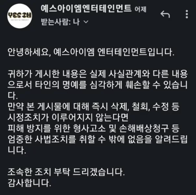 소속사 측은 "귀하가 게시한 내용은 실제 사실관계와 다른 내용으로서 타인의 명예를 심각하게 훼손할 수 있다"며 "만약 본 게시물에 대해 즉시 삭제, 철회, 수정 등 시정조치가 이뤄지지 않는다면 피해 방지를 위한 형사고소 및 손해배상청구 등 엄중한 사법 조치를 취할 수밖에 없음을 알려드린다. 조속한 조치 부탁드린다"고 전했다.
