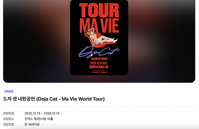 공연기획사 라이브 네이션 코리아는 8월 22일 “도자 캣이 오는 12월 13일 오후 7시 경기 고양 킨텍스 제2전시장 10홀에서 한국 팬들과 만난다”고 밝혔습니다. 이번 무대는 도자 캣이 아시아 투어 중 한국에서 단독으로 여는 첫 공연이라는 점에서 더욱 의미가 큽니다.