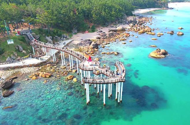 파도가 데크 아래로 밀려들 때마다 기둥 사이에서 잔잔한 울림이 생기고, 바람이 강한 날에는 파도 소리가 더 생생하게 들린다. 무엇보다 이곳은 사진이 유독 잘 나오는 명소다. 바다·숲·데크의 선이 자연스럽게 한 화면을 채운다.