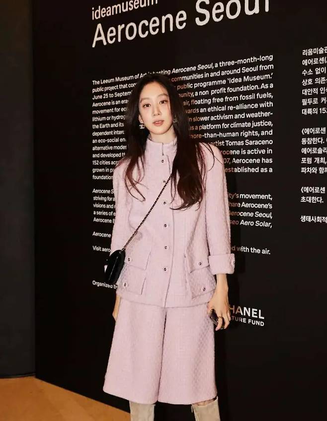 려원은 라일락빛 트위드 소재의 세트업을 선택해 고급스러운 이미지를 연출했다. 상의는 사파리 재킷 형태로 다수의 포켓과 버튼 장식이 더해져 단조로움을 피했다. 하의는 종아리 중간까지 오는 롱 버뮤다팬츠로 포멀한 인상을 주지만 부드러운 파스텔 톤 덕분에 부드럽고 세련된 분위기가 살아난다.