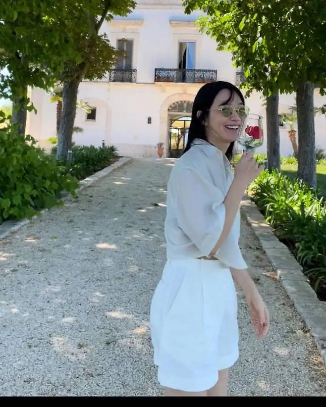 신민아는 여름에 잘 어울리는 미니멀한 올 화이트 반바지 스타일을 선보였다. 하이웨이스트 디자인의 반바지는 허리 라인을 잡아주며 밑단을 살짝 접은 디테일이 단정함을 더한다.