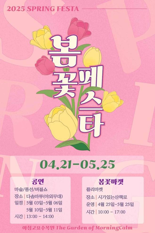 이곳에서는 매년 봄마다 ‘아침고요수목원 봄꽃 페스타’가 열리며, 올해는 4월 21일부터 5월 25일까지 진행된다.
