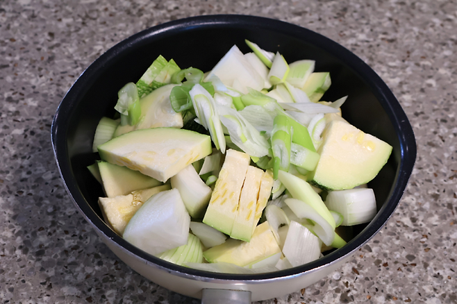 일반 애호박 1개, 양파 1/2개, 대파 1/2대 준비해서 호박은 손가락 두께 정도로 두툼하게 부채꼴 모양으로 썰면 되고요. 양파도 그냥 대충 큼직하게 썰면 됩니다. 대파는 어슷어슷 크게 썰면 되고요. 어차피 푹 끓이면 애호박, 양파 모두 부드럽게 익기 때문에 큼직하게 썰어주세요.