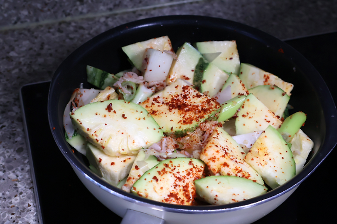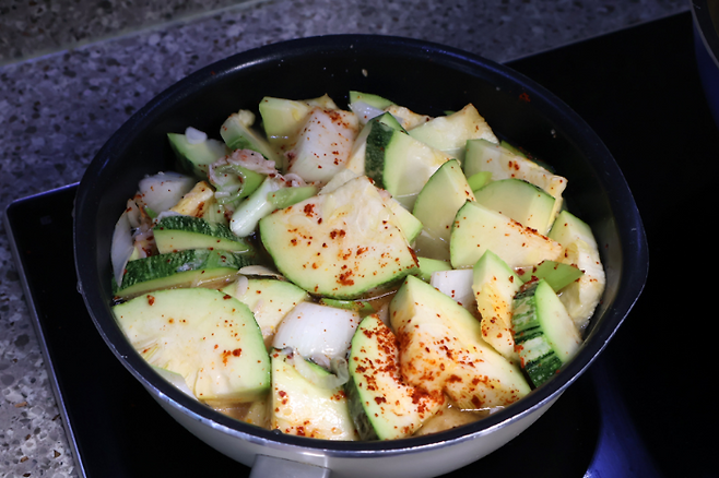 냄비에 담고 그 위에 고춧가루 1큰술, 새우젓 1큰술, 다진마늘 1큰술, 식용유를 한바퀴 둘렀어요. 애호박찌개 레시피에서 간은 새우젓으로 맞추면 되는데 처음부터 많이 넣으면 너무 짜니까 새우젓 1/2큰술 부터 넣고 간을 보면서 추가하는 것을 권합니다. 저는 하도 많이 끓여서 호박 양에 따라 감으로 새우젓의 양을 조절하는 편이에요.
