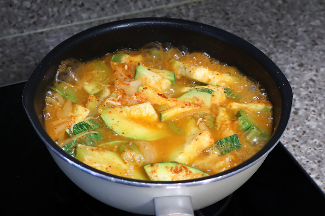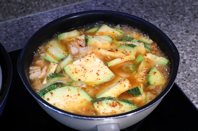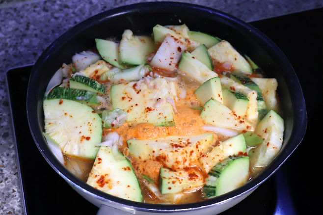 바글바글 센불로 끓여요. 처음엔 좀 하얀가? 싶지만 고춧가루가 물에서 불어나면서 전체적으로 붉은 빛으로 바뀔 거예요. 이제 호박이 뭉근하게 익을 때 까지 끓이면 됩니다.