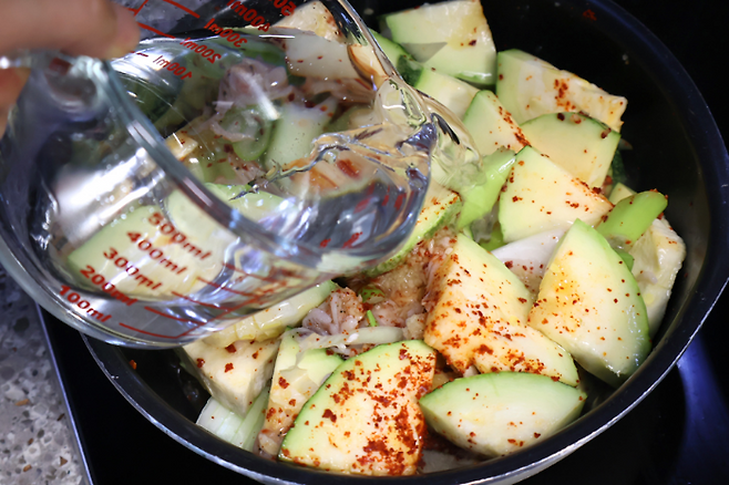 그리고 물을 부어요. 이때 물의 양이 가장 중요해요. 왕창 붓지 말고 딱 재료가 잠길까? 말까? 할 정도로만 부어야 해요. 그래야 싱겁지 않고 간이 딱 맞는 찌개를 끓일 수 있답니다.