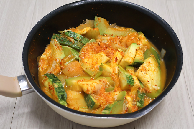 이렇게 국물이 자작해지고 호박이 뭉근하게 익으면 완성이에요. 호박의 달큰한 맛과 새우젓의 짭짤하면서도 감칠맛 나는 그 맛이 어우러져 흰 쌀밥과 정말 잘 어울리는 애호박찌개 레시피가 완성 되었습니다.