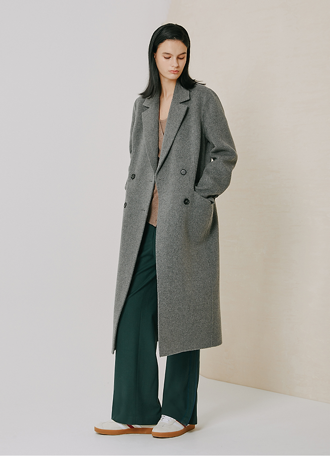 니엔이 착용한 핸드메이드 코트는 테일러드 더블 버튼 여밈과 적당한 슬림 오버핏, 여유있는 길이감으로 스타일리시한 윈터룩을 연출한다.
