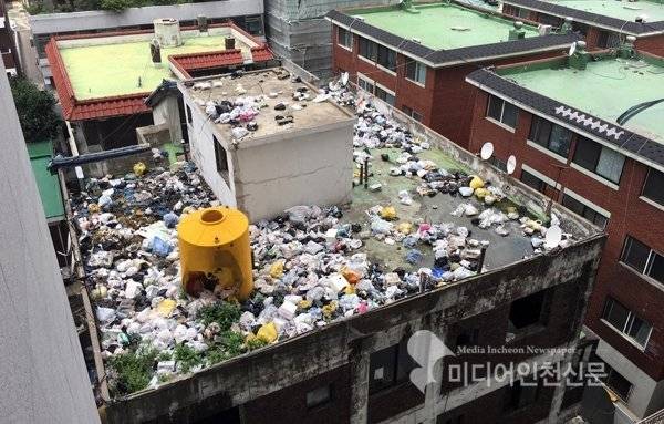 인천의 한 빌라 옥상에서 3.5t 가량의 생활쓰레기가 무단투기 되었는데 이 쓰레기들은 모두 바로 옆 고층 오피스텔에서 투척된 것으로 파악됨