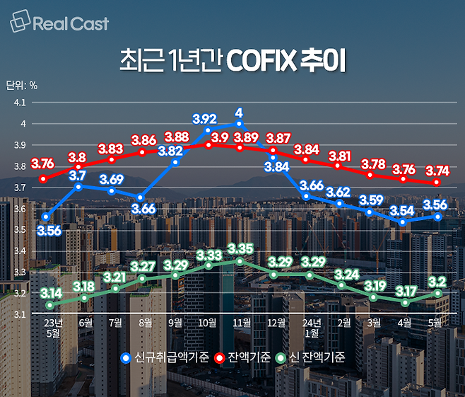 은행연합회가 공시한 5월 기준 코픽스에 따르면 신규 취급액 기준 코픽스는 3.56%로 전월보다 0.02%포인트 상승했습니다. 이는 6개월 만에 상승한 것으로 신규 코픽스는 지난해 12월부터 4월까지 5개월 연속 하락한 바 있습니다.