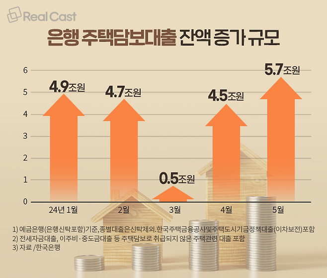 한편, 은행권 주택담보대출은 한 달 새 약 5.7조원이 증가했습니다. 4월부터 본격화된 디딤돌(구입), 버팀목(전세) 등 정책성 자금 대출 시행과 전셋값 상승에 따른 부동산 시장 반등으로 주택 거래가 늘어난 것으로 풀이됩니다.