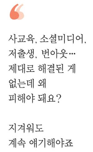 “그 지시가 잘못이에요. 제대로 해결된 게 없는데 왜 피해야 돼요? 대한민국에서 사교육 문제 같은 건 2043년에도 그대로일 텐데. 지겨워도 계속 얘기해야죠. 다른 이슈들도 다요.”