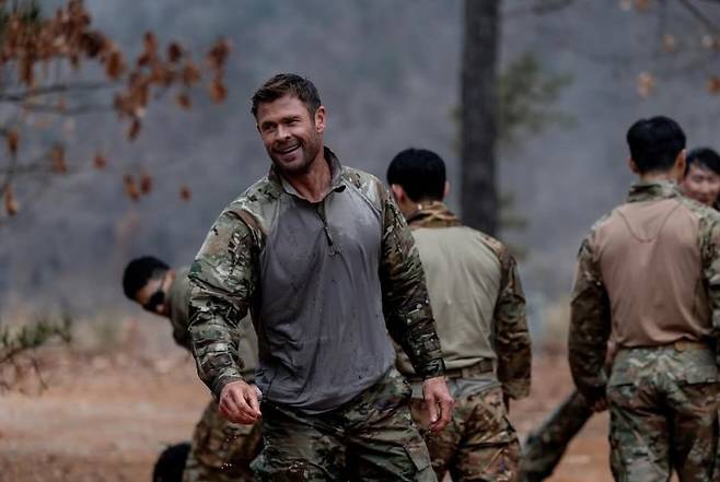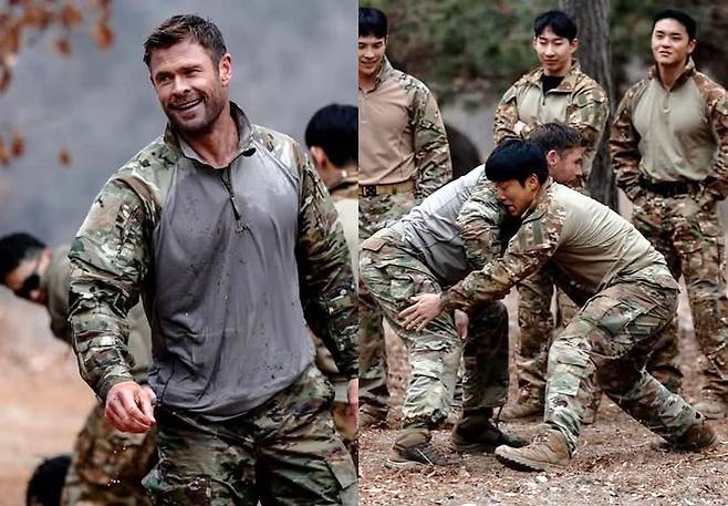 크리스 헴스워스가 자신의 소셜미디어에 업로드한 사진은 군복을 입은 한국 군인 혹은 한국인들과 함께 씨름을 하며 어울리는 사진과