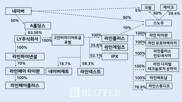 네이버는 소프트뱅크와 A홀딩스 지분 매각을 협의 중이다. 소프트뱅크 지분이 더 커질 경우 LY주식회사와 그 자회사에 관한 네이버의 영향력은 줄어든다. LY주식회사 전체 지배구조도를 보면 일본 업체들이 탐을 낼만 한 사업체들이다.