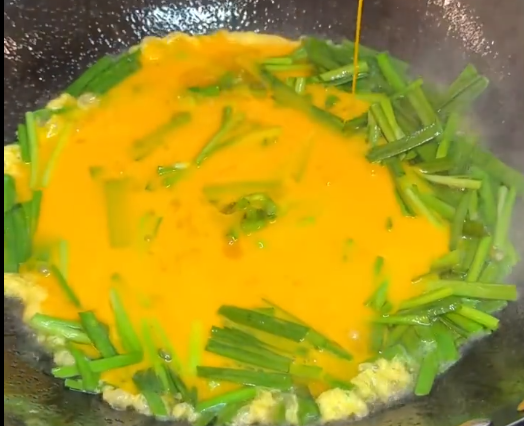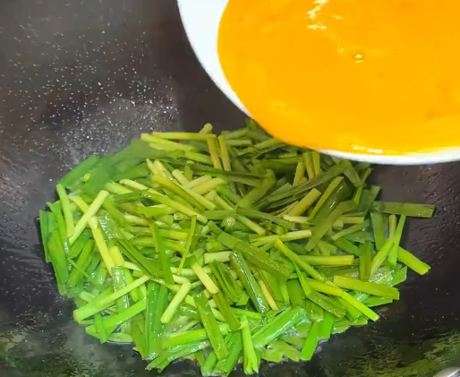부추가 살짝 볶아지면 불을 중불로 낮추고, 미리 풀어둔 계란을 부어주세요.