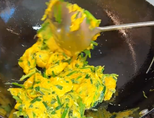 젓가락이나 주걱으로 계란과 부추를 함께 저어가며 스크램블 형태로 만들어주세요. 계란이 너무 익지 않도록 부드럽게 저어주는 것이 중요해요.