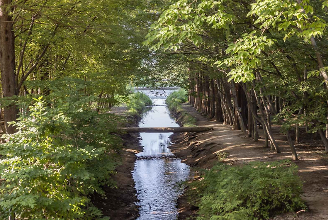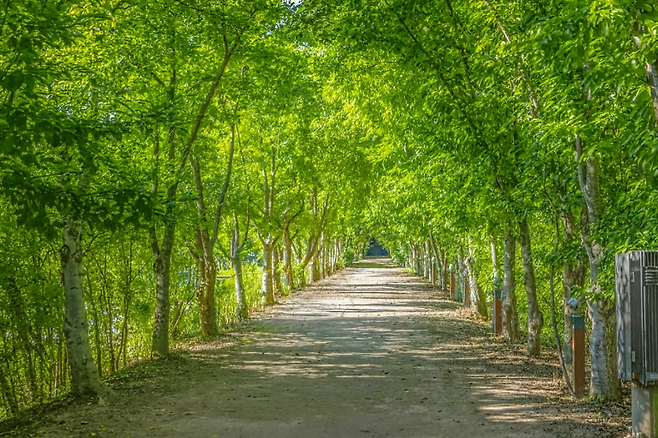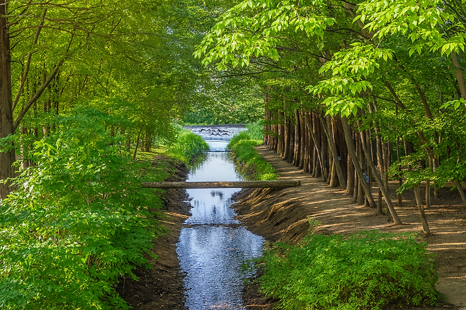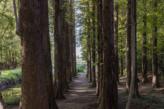 ▶ 메타세쿼이아 숲길과 거울숲: 하늘로 뻗은 나무와 개울에 비친 풍경이 압도적인 포토존