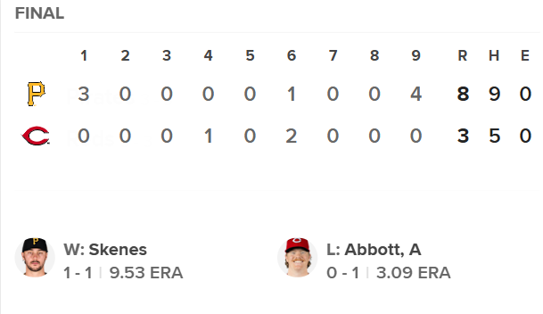 피츠버그 파이리츠는 1회 오닐 크루즈의 3점 홈런과 9회 터진 브라이언 레이놀즈의 쐐기포를 묶어 8-3으로 승리하며 위닝 시리즈를 가져갔다. 개막전 참패 이후 빠르게 평정심을 되찾은 스킨스가 다음 등판에서 투구 수와 이닝 소화력을 어디까지 끌어올리며 선발 로테이션의 확실한 축으로 자리 잡을지가 피츠버그 선발진의 핵심 과제가 될 전망이다.