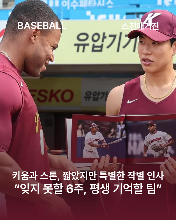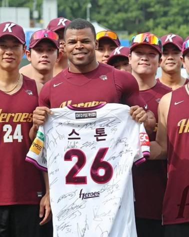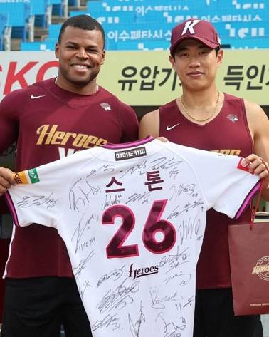 스톤은 선수단 전원이 참석한 가운데 열린 송별 행사에서 주장 송성문에게 단체 사인 유니폼과 사진첩을 선물받았습니다.