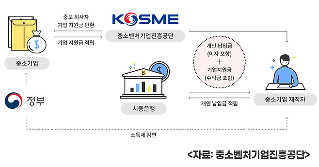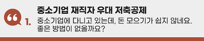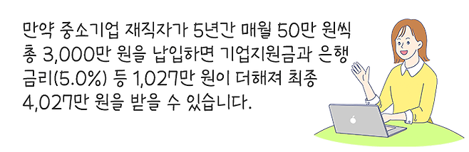 중소기업 재직자가 월 10~50만 원(가입 단위 1만 원)을 적립하고 중소기업은 재직자 납부금의 20%를 지원하여 만기 시 재직자에게 전액 지급하는 상품입니다.