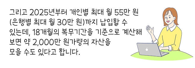 2025년부터 새로워지는 내용은 아래의 그림을 참조하시기 바라며, 더 자세히 알고 싶으시면 청년도약계좌 홈페이지(ylaccount.kinfa.or.kr)에 들어가시면 됩니다.