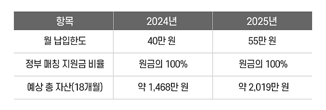 가입하면 5% 수준의 은행이자와 이자소득에 대한 비과세, 적금 만기 해지 시 매칭지원금을 지원받을 수 있는데, 24년부터는 원금의 100%에 해당하는 매칭지원금을 받을 수 있습니다.