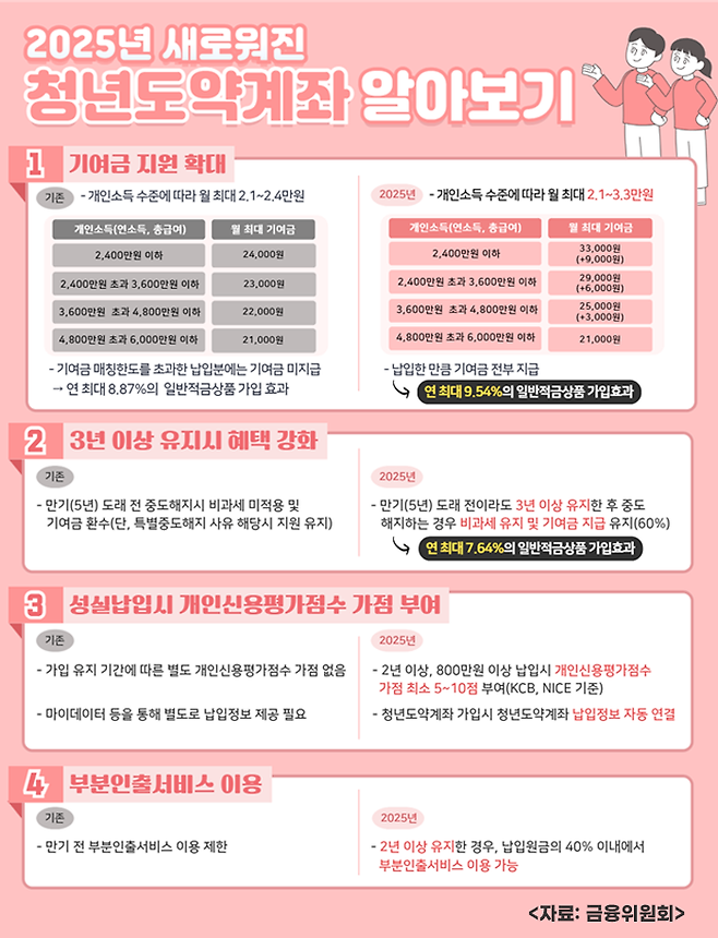 게다가 2025년에는 기여금 지원 확대, 3년 이상 유지 시 혜택 강화, 성실 납입 시 개인신용평가점수 가점 부여 등 지원을 강화하기로 하여 가입자 수는 더 높아질 것으로 전망됩니다.