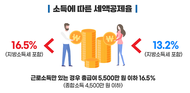 근로소득만 있는 경우에는 총급여가 5,500만 원(종합소득 4,500만 원) 이하인 경우 16.5%(지방소득세 포함), 이보다 소득이 많은 사람에게는 13.2%의 세액공제율이 적용됩니다.