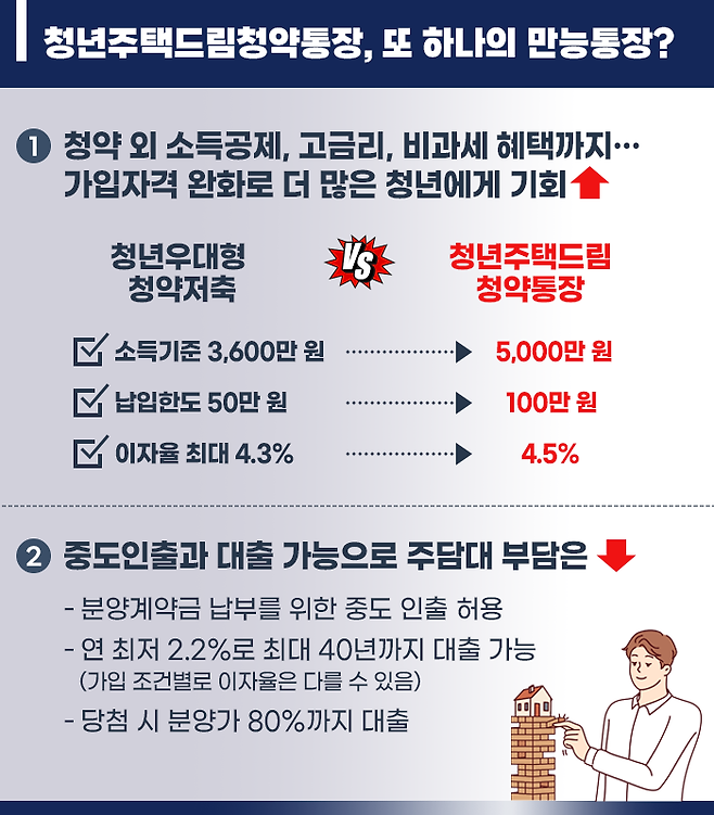 기존 청년우대형 주택청약종합저축의 가입 대상과 지원 내용을 대폭 확대∙개편해 2024년 2월에 출시된 청년주택드림청약통장은 만 19~34세 청년 중 연소득 5,000만 원 이하(기존 3,600만 원)의 무주택자라면 누구나 가입이 가능합니다.