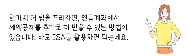 ISA 만기 금액(의무가입기간 3년)을 연금계좌로 이체하면, 이체한 금액의 10%(최대 300만 원)까지 추가로 세액공제, 즉 추가로 연말정산 혜택을 받을 수 있고, 노후자금을 증가시킬 수 있는 효과 또한 누릴 수 있습니다.