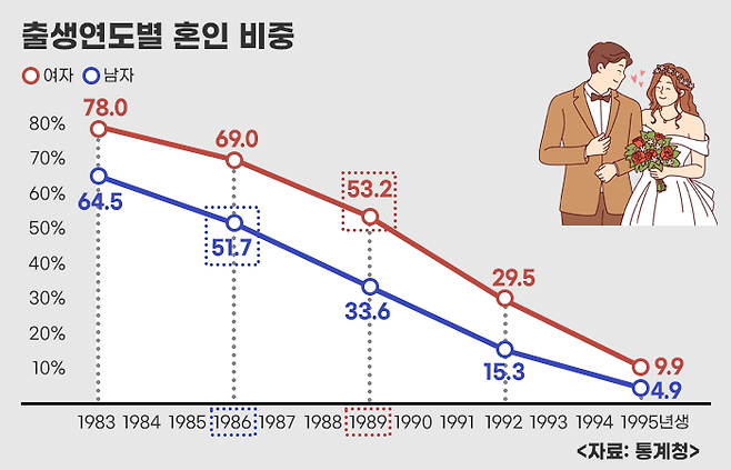 2022년 통계청의 자료에 의하면 남자는 만 36세(1986년생), 여자는 만 33세(1989년생)가 되어서야 혼인율이 절반을 넘어섰다고 합니다.