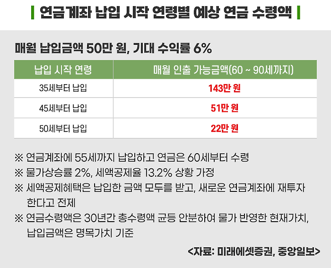 예를 들어 35세부터 20년간 연금계좌에 50만 원을 납입하고 60세부터 90세까지 연금을 수령한다고 가정해 보면, 매월 143만 원 정도의 금액을 받을 수 있습니다.