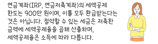 세액공제 대상금액의 16.5%를 환급받을 수 있으므로, 900만 원을 세액공제 받으면 최대 148만 5천 원의 세금을 환급받을 수 있습니다.