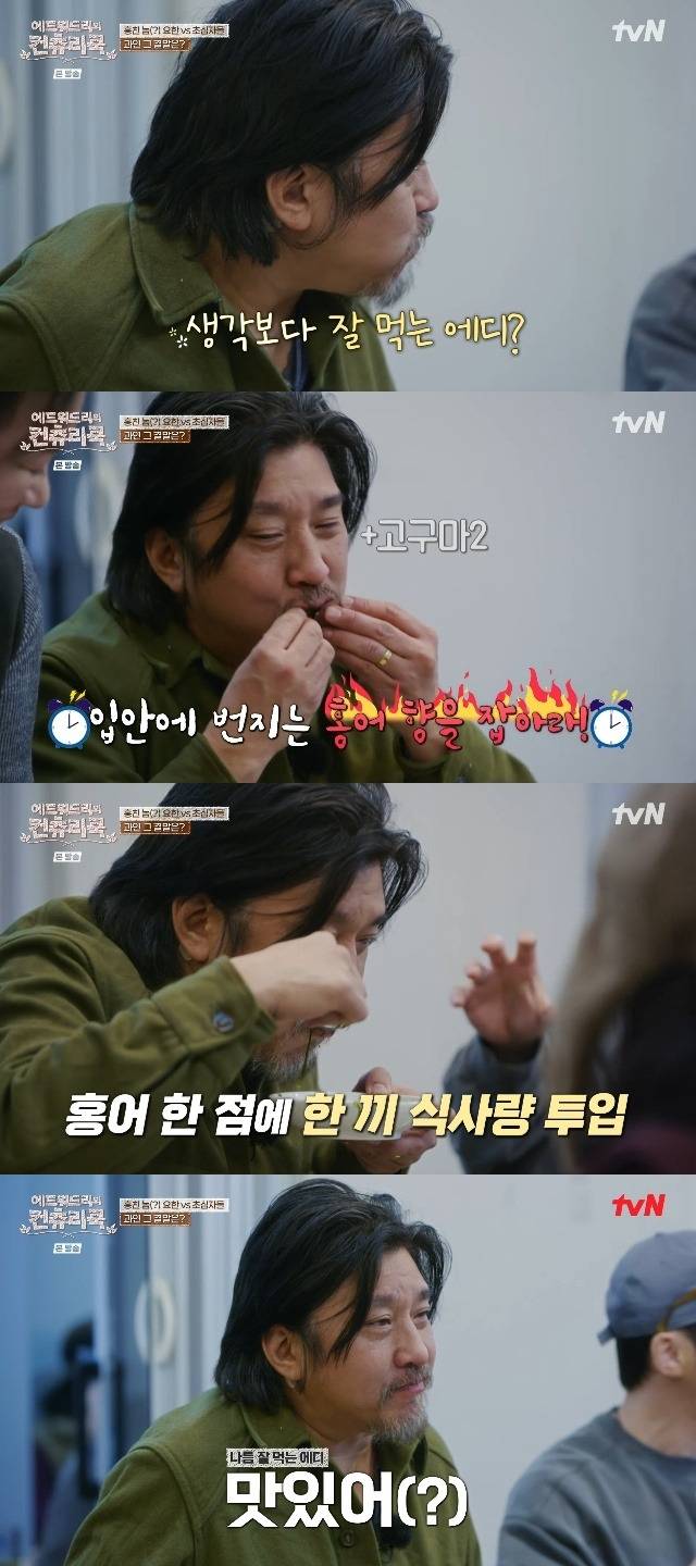 직접 다시 접한 홍어의 맛은 예상보다 강했다. 에드워드 리는 첫 입을 먹은 직후 말없이 멈춰 섰고, 눈동자에 초점이 사라지는 장면이 그대로 화면에 담겼다. 말보다 눈이 먼저 반응한 셈이었다.