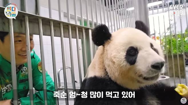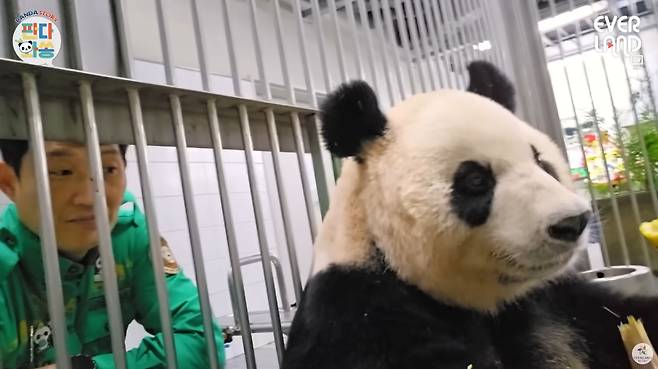지난 4월 26일 공개된 에버랜드 공식 유튜브 채널에는 '본격 루이후이가 송바오 놀아주는 판다월드 현장'이라는 제목의 영상이 올라왔는데요. 영상 초반부부터 송바오 송영관 사육사는 엄마 아이바오에게 커다란 죽순을 건네주며 애정을 보여줬습니다. '최애 음식'인 죽순을 손에 든 아이바오는 '이뻐이뻐' 얼굴로 맛있게 죽순을 까서 먹방을 보여줬는데, 그 모습을 담던 송 사육사는 푸바오의 근황을 직접 들려줬습니다.