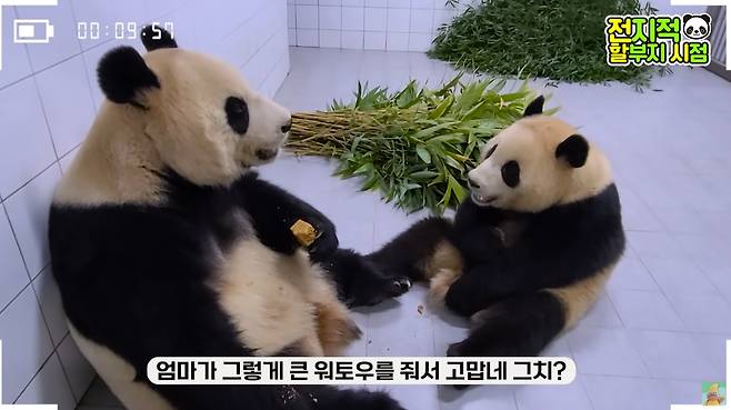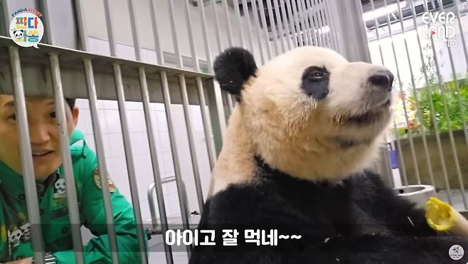 특히 아이바오는 송 사육사의 말에 귀를 기울이는 듯 옆을 쳐다보기도 했는데요. 마치 첫째 딸의 중국 유학 소식을 기다리고 '믿고 있었다'는 듯이 편안한 반응을 보인 아이바오의 모습이 인상적이었습니다.