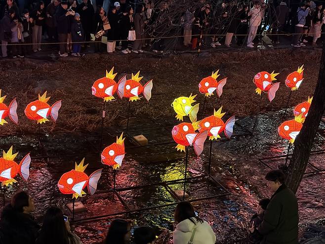'포켓몬고' 게임을 몇 년째 즐기고 있는 나로서는 그냥 지나칠 수 없는 풍경이었다. 화면 속에서, 그리고 도감 속에서 수도 없이 만나왔던 잉어킹이 현실 공간에서 빛으로 떠올라 있었다. 광교에서 장통교까지 이어진 약 70미터 구간, 크고 작은 잉어킹들이 물길을 따라 고개를 들고 있었다.