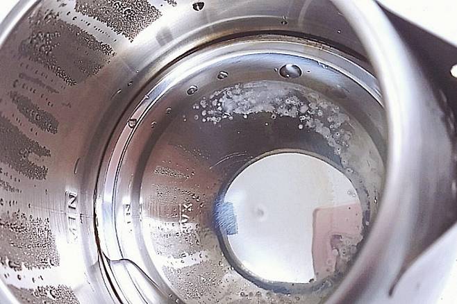 잠시 후 확인해 보면 손으로 닦지 않았는데도 석회가 말끔히 제거됐어요. 식초로 끓여주면 광도 난답니다.