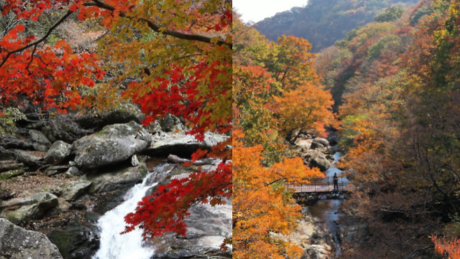전남 구례의 피아골은 지리산 단풍 명소로 손꼽힌다. 가을이면 계곡 양쪽으로 붉은 단풍이 길게 늘어서며 산책로 전체가 붉은 터널로 변한다. 여기에 맑은 계곡물이 흐르며 단풍과 어우러져 시각과 청각 모두를 채워준다.