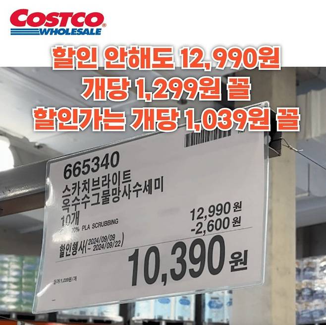 예를 들면, 한 브랜드의 수세미는 일반 마트에서는 개당 1,664원이지만, 코스트코에서는 개당 1,299원입니다. 이처럼 1개당, 100ml당, 100g당 단위로 따져보면, 코스트코 쇼핑이 더 이득 보는 쇼핑이 되는 셈이죠.