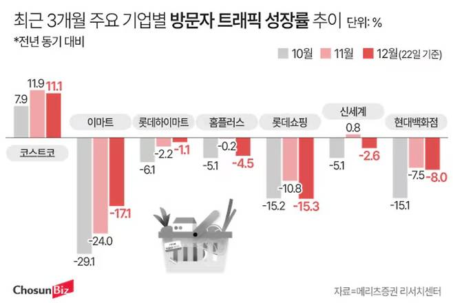 또 최근에 발표된 방문자 트래픽 조사에 따르면, 국내 유통 업체 중 코스트코 홀로 방문자 트래픽이 매달 성장하는 것을 알 수 있습니다. 방문객의 발길을 사로잡는 오프라인 강자로 자리매김하고 있다는 것을 보여주죠.