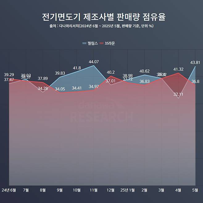 전기면도기 시장은 필립스와 브라운이라는 전통적인 양강 구도가 치열하게 유지되고 있다. 3위 업체인 파나소닉도 존재하지만, 시장 점유율이 10%에 미치지 못해 실질적으로는 두 브랜드가 주도하는 경쟁 구도라 봐도 무방하다. 지난 1년간 이 두 브랜드는 점유율 1위 자리를 두고 엎치락뒤치락 혼전을 벌인 모습이다. 2024년 11월에는 필립스가 44.07%까지 치고 올라가며 우위를 점한 반면, 2025년 4월에는 브라운이 41.21%까지 따라붙으며 반격했다. 최근에는 필립스가 43.81%를 기록하며 다시 선두 자리를 탈환했지만, 격차는 크지 않아 당분간 접전이 이어질 것으로 보인다. 실제로 지난 1년간의 평균 점유율을 살펴보면 필립스가 38.97%, 브라운이 37.64%로 불과 1.3%포인트 차이에 그친다. '자강두천'이라는 말이 딱 어울리는 전기면도기 시장이라 하겠다.