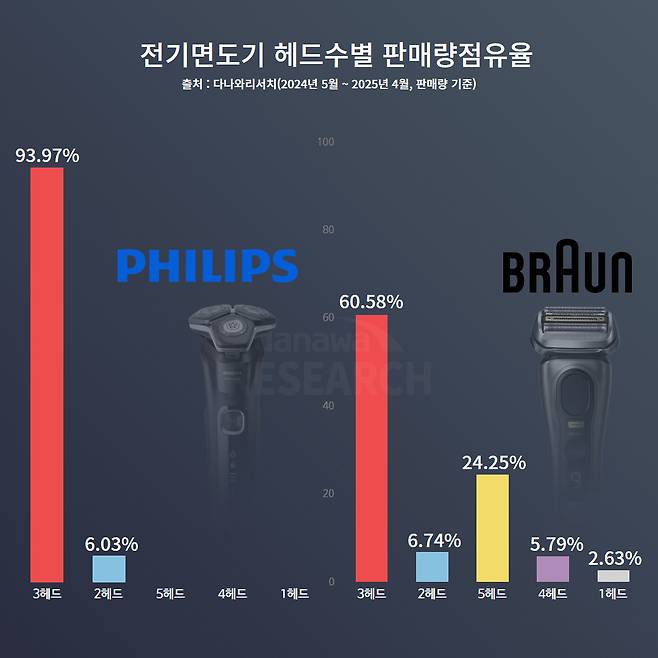 양사 제품의 특징도 뚜렷하게 갈린다. 필립스는 회전형 헤드 중심의 제품군을 개발하며, 특히 3개의 원형 커터가 회전하며 면도하는 ‘3헤드 회전형’ 방식이 전체 라인업의 93.97%를 차지한다. 나머지는 2헤드 제품으로, 구조적으로 그 외 헤드는 존재하지 않는다. 반면 브라운은 좌우로 왕복하는 직선형 커터를 탑재한 제품을 주력으로 삼는다. 이른바 왕복형 헤드 제품군은 3헤드가 60.58%, 5헤드가 25.45%로 다수를 이루며, 이외에도 1~4헤드 제품이 고르게 분포되어 있다. 덕분에 소비자 입장에서는 선호하는 면도 방식이나 자신의 수염 상태에 따라 필립스의 회전식 혹은 브라운의 왕복식을 선택만 하면 되므로 많은 고민을 하지 않아도 된다.