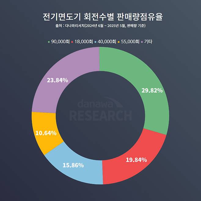 한편, 전기면도기의 성능을 가늠하는 주요 지표 중 하나인 모터 회전수도 흥미로운 양상을 보인다. 전체 시장에서는 분당 9만 회 회전하는 고속 모터 제품이 29.82%로 가장 높은 점유율을 기록하고 있으며, 그 뒤를 1만8000회(19.84%)와 4만회(15.96%) 제품이 잇고 있다. 이 중 9만 회 고속 회전 모터는 필립스 SkinIQ 5000 시리즈에서 주로 사용되며, 해당 제품군이 판매량 1위를 차지하는 데 기여하고 있다. 회전수가 높을수록 빠르고 강력한 절삭력이 장점이지만, 그만큼 배터리 소모가 빨라지는 만큼 무조건 유리한 요소는 아니다. 그만큼 실제 사용기나 리뷰를 참고해 자신에게 적절한 회전수를 고르는 것이 중요한 포인트다.