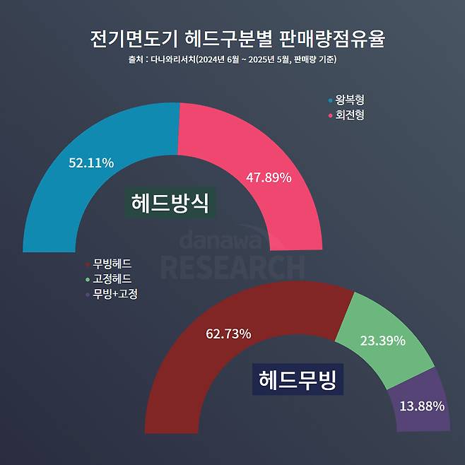 양사 제품의 특징도 뚜렷하게 갈린다. 필립스는 회전형 헤드 중심의 제품군을 개발하며, 특히 3개의 원형 커터가 회전하며 면도하는 ‘3헤드 회전형’ 방식이 전체 라인업의 93.97%를 차지한다. 나머지는 2헤드 제품으로, 구조적으로 그 외 헤드는 존재하지 않는다. 반면 브라운은 좌우로 왕복하는 직선형 커터를 탑재한 제품을 주력으로 삼는다. 이른바 왕복형 헤드 제품군은 3헤드가 60.58%, 5헤드가 25.45%로 다수를 이루며, 이외에도 1~4헤드 제품이 고르게 분포되어 있다. 덕분에 소비자 입장에서는 선호하는 면도 방식이나 자신의 수염 상태에 따라 필립스의 회전식 혹은 브라운의 왕복식을 선택만 하면 되므로 많은 고민을 하지 않아도 된다.