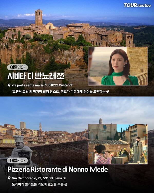 드라마 속 예능 프로그램 '로맨틱 트립'의 마지막을 장식한 고백 장면은 중세풍의 절경 마을, 시비타 디 반뇨레쪼에서 촬영되었습니다.