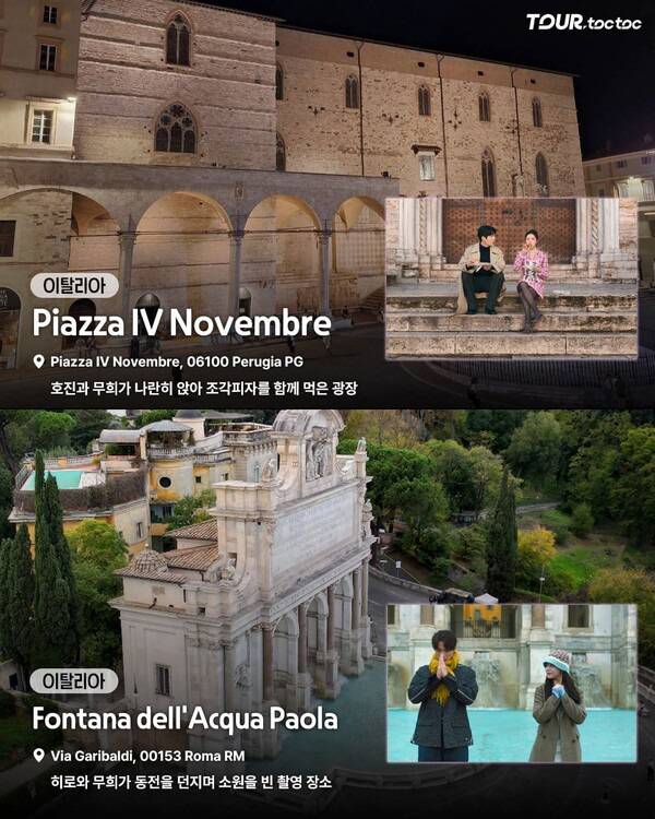 Piazza IV Novembre는 페루자의 중심 광장으로, 드라마에서는 조각피자를 나눠먹으며 다정한 시간을 보내는 장면의 배경이 됩니다.