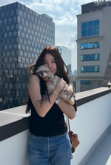 빽빽한 빌딩 숲 위로 파란 하늘이 펼쳐진 도시의 루프탑. 한 여배우가 반려견을 품에 안고 햇살처럼 웃는다.